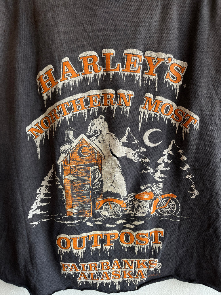 Now this one’s been worn to hell and back. Beautifully faded out Harley chopper, featuring crazy prints on both sides. “Just Ride It” Nike rip on the front, incredible Fairbanks Alaska dealer print on the back. Sleeves gone, cropped waist and neck cut. Truly customized. Some bleach and paint spots, fading to the graphic, fraying, pinholes, whatever you could want in the world of distressing. Still has plenty of life left!