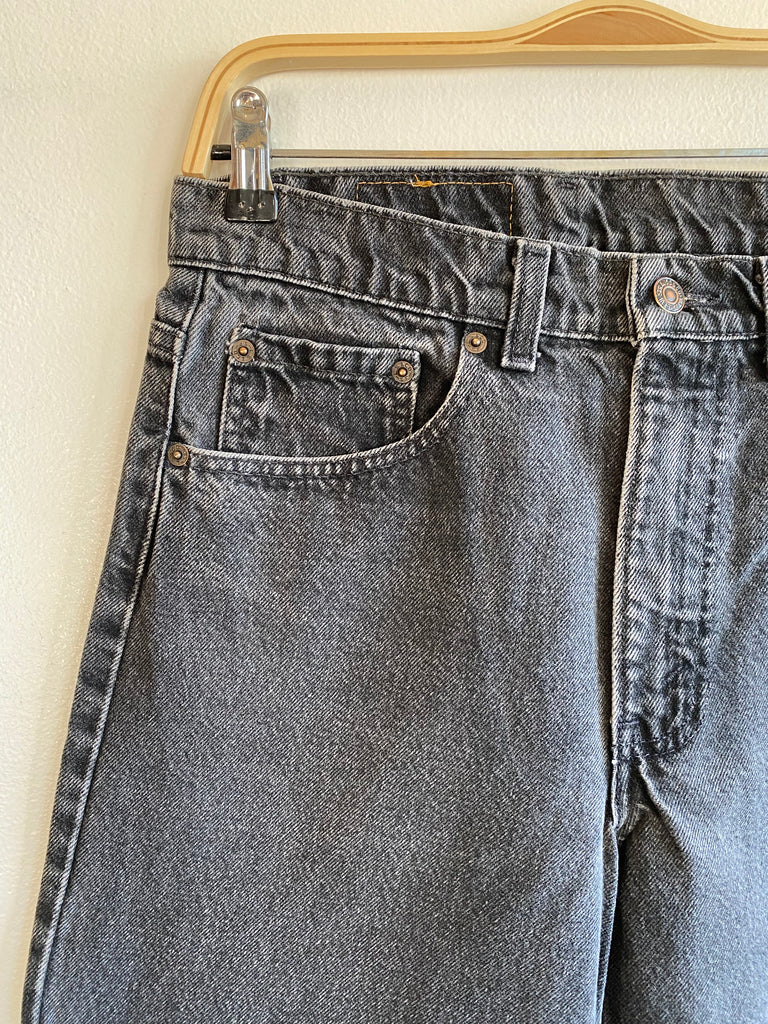 Another pair of faded beauties, ready for years and years of more wear and tear. Levi’s 550 in a color that was once black but now resembles more of a gunmetal grey. Five pocket construction with zipper crotch closure and Levi’s branded hardware throughout.