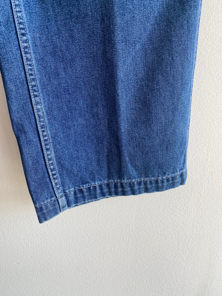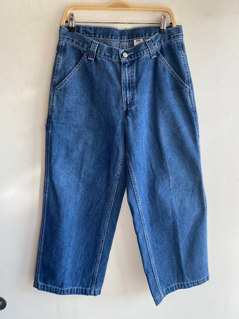 One of the biggest leg opening-to-waist ratios I’ve ever seen on pair of Levi’s, only rivaled by another pair from this drop! Pretty scare Levi’s Dry Goods carpenter jeans in a wide leg fit, featuring a zipper crotch closure and six pockets plus hammer loop. Silver stitching throughout, really funky pair. No holes or stains whatsoever, ready to go!