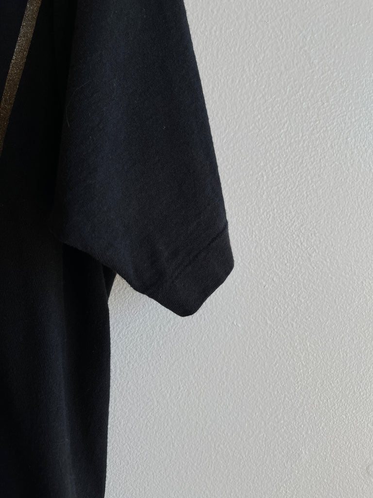 Now while I can’t say I’m remarkably aware of her music, I can only assume somebody willing to use this much sparkly ink on a tee shirt is probably one bad mamajama. Crispy early 1990’s Glady’s Knight tee, featuring a beautiful multicolored print on the front, blank back. Single stitch hems all the way around, blank back. No holes or stains, just some cracking to the graphic. Decades of life left!