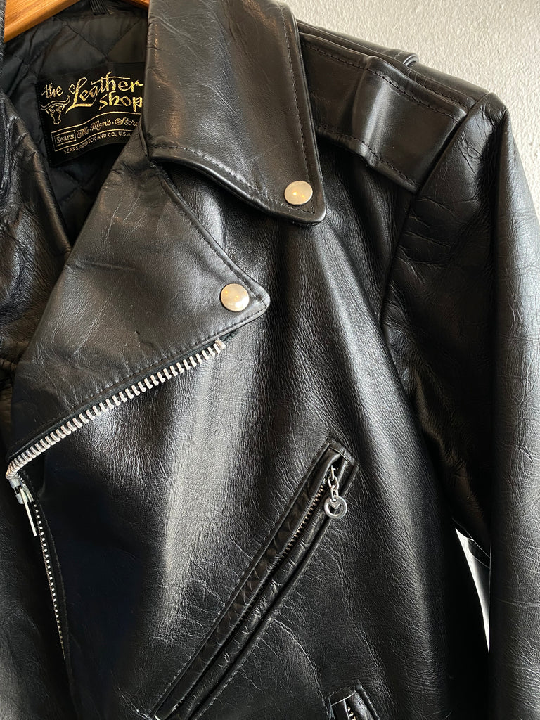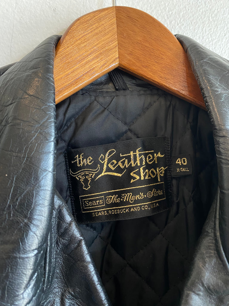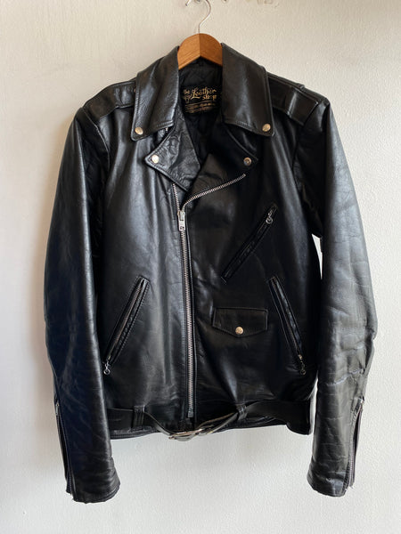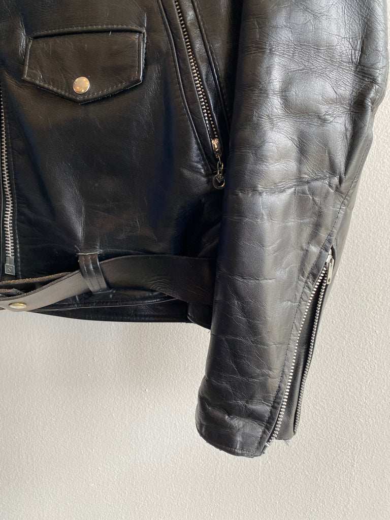 If you’ve been starving yourself to squeeze into that size 36 Schott we have in store, you can sign a breath of relief! Beautiful leather in fantastic shape from Sear’s Leather Shop. Lenzip zippers throughout, and some funky chain zippers at the pockets. Leather is still supple amd strong. Minor tear in the right armpit lining, but otherwise no flaws!