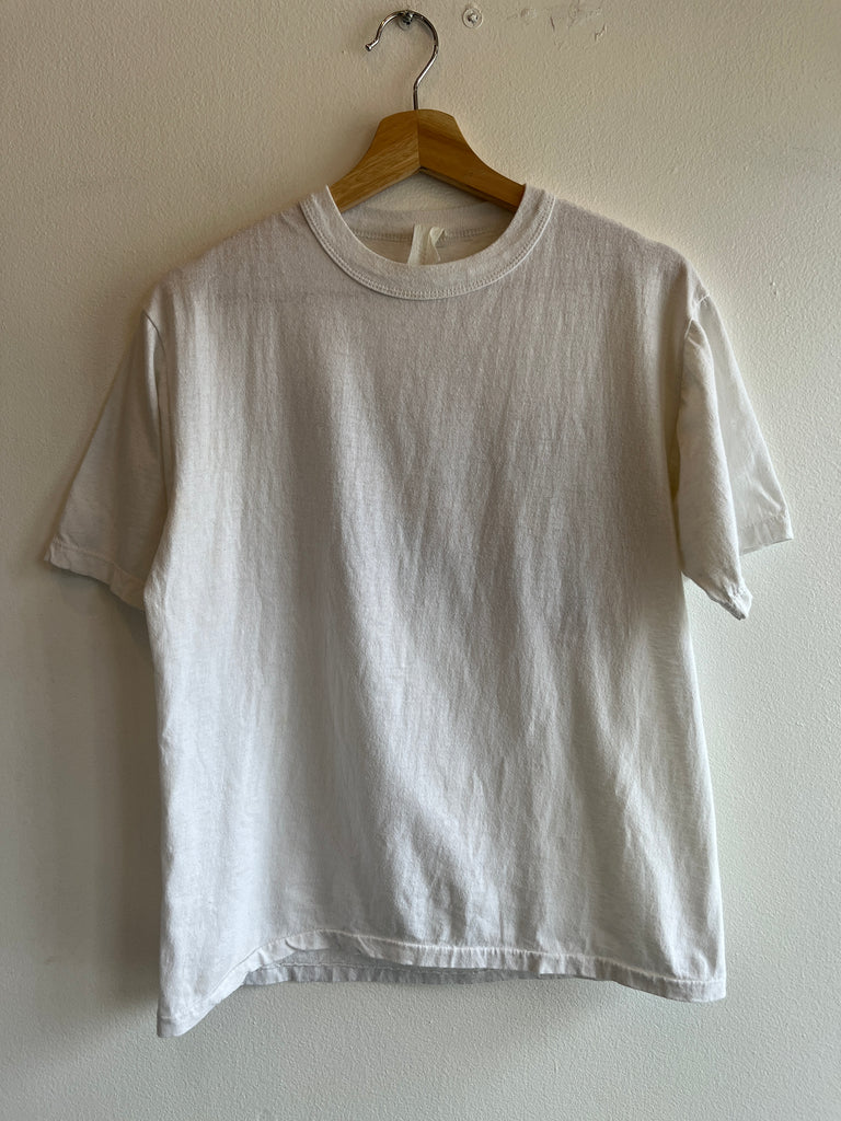 What a tee! If only the graphic was on both sides, but for those who like a good mullet! White all cotton tee from the 1970/80’s featuring a large multicolored print on the back, blank front. Mounted collar, double stitch arm hems and a single stitch waist (just to make it confusing). Some cracking to the graphic but no stains or holes!