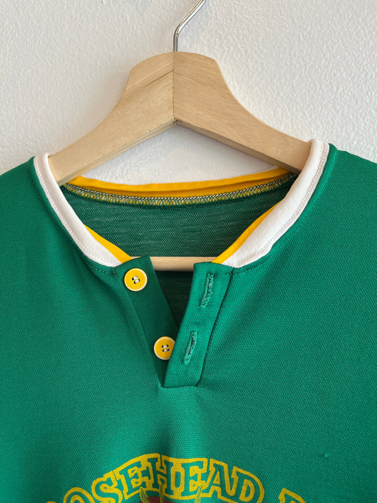 Now I’ve never had this beer, but I think we’ve had almost every variant of promotional shirt for Moosehead drift through the shop. Tee, thermal, and now jersey! Poly cotton blended green jersey with white and yellow cuff action. Prints on the front and back, cracking but holding on steady! Henley style button closure neck. Minor pilling throughout but otherwise sound!