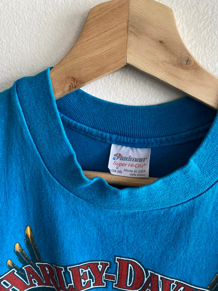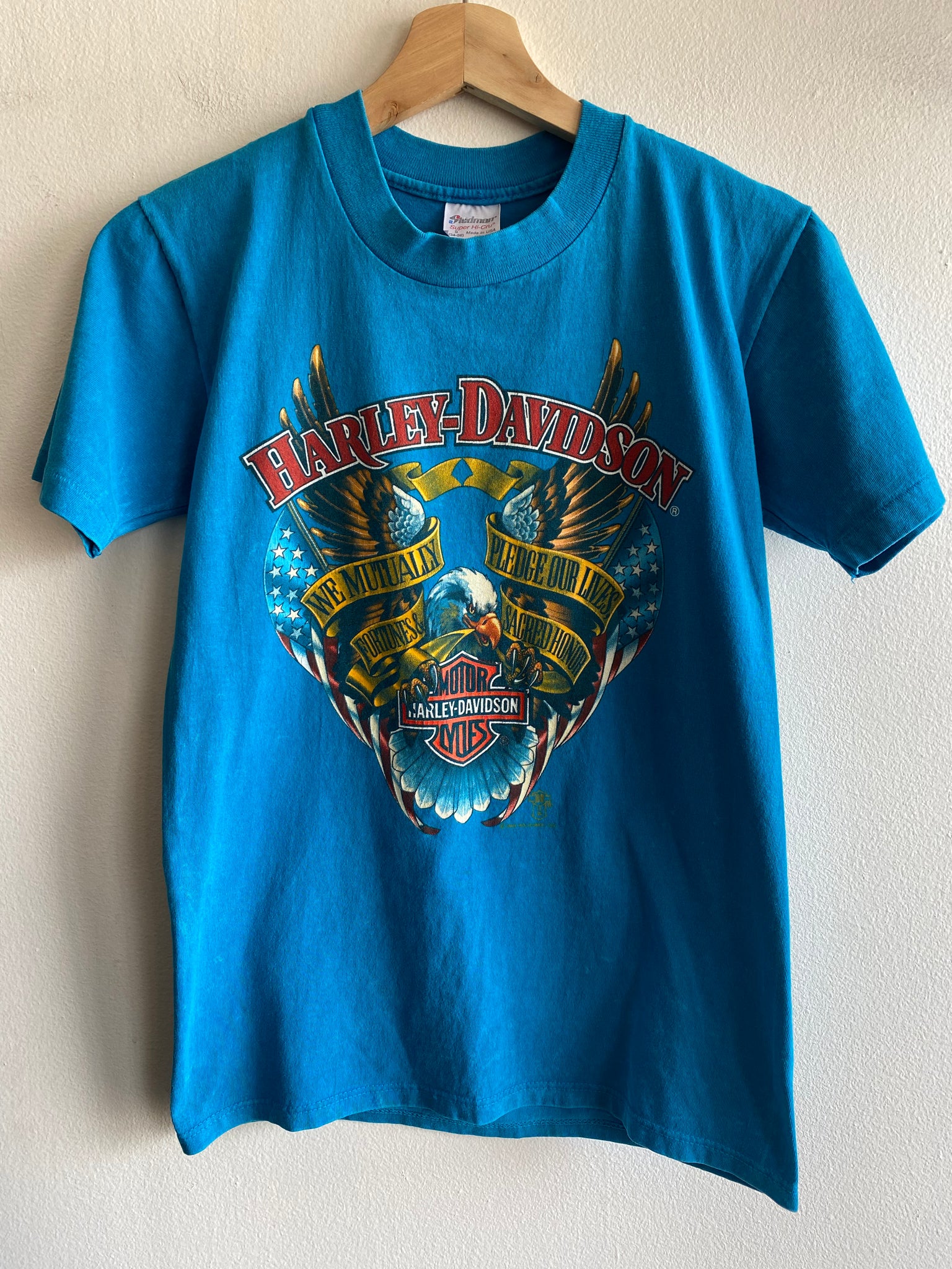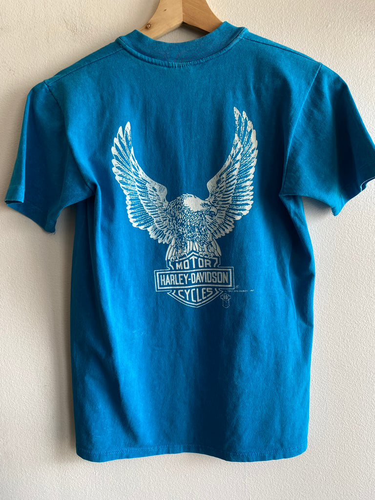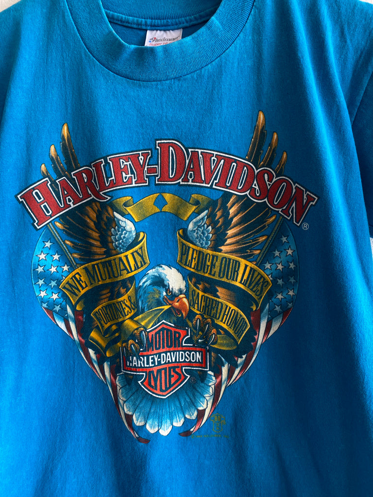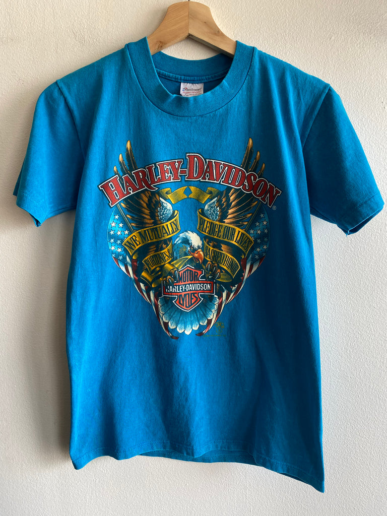 Alright, count ‘em, I’m seeing TWO EAGLES on this bad boy. Thats twice as much freedom. Vibrant blue Harley Davidson shirt from 1988, 100% cotton with multicolored print on the front, single color print on back. Single stitch hems at the sleeve, double at the bottom. Some minor cracking going on, but otherwise sound! Hard to see in photos but shirt seems to be very faintly tie-dyed with bleach.