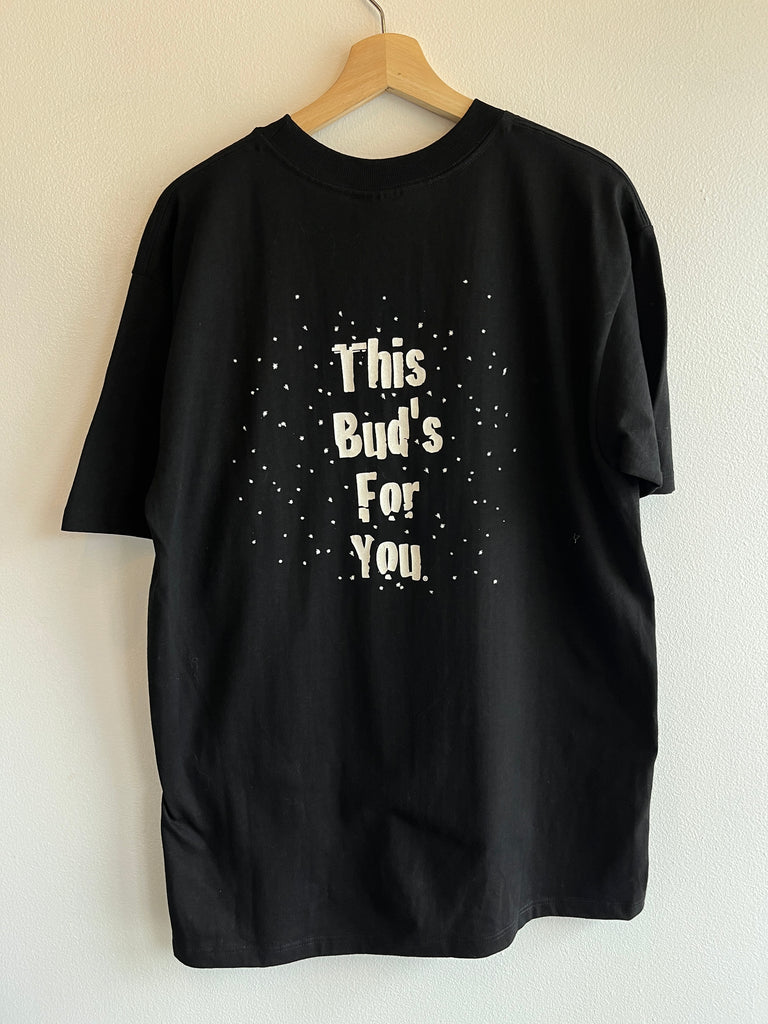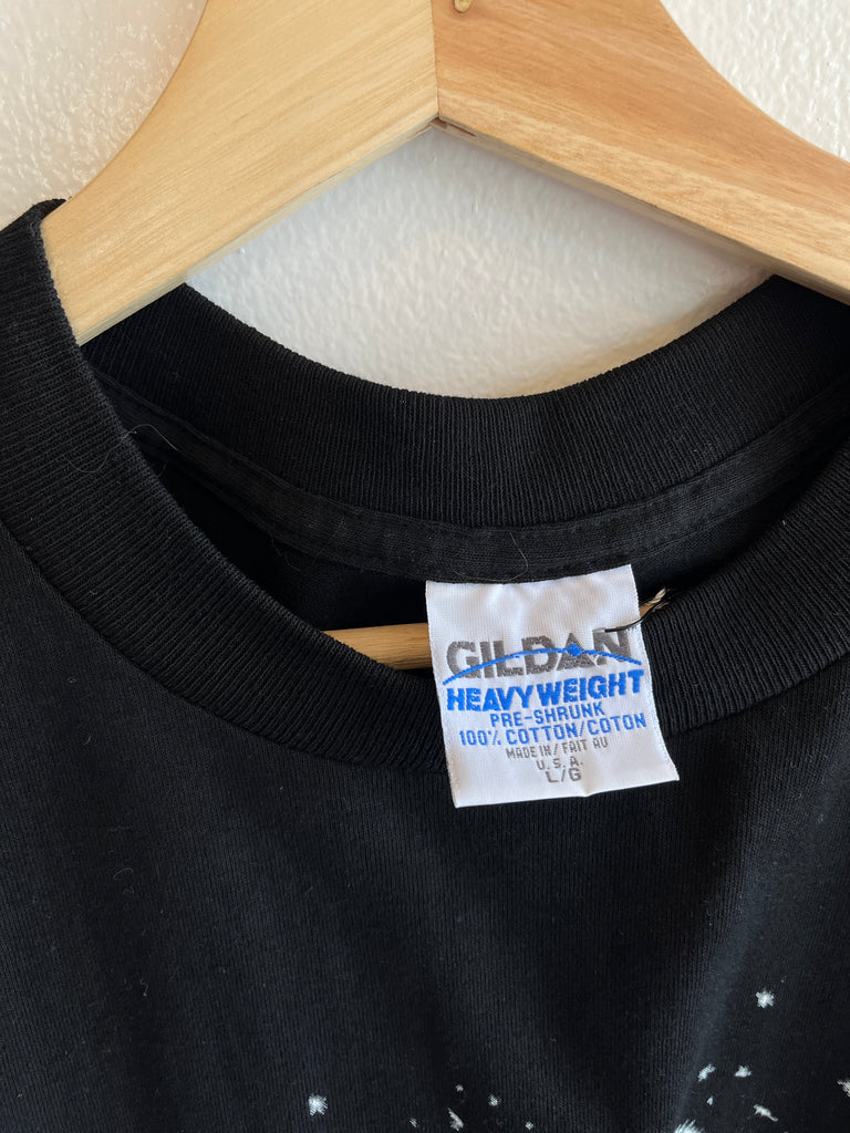 While I don’t necessarily recommend three friends tonguing the same beer, I can only imagine these frogs are having the time of their life. Incredible condition Budweiser tee from 1996, black cotton featuring large prints on both sides. Thick, chunky collar and double stitched hems all over for extra reinforcement! No flaws whatsoever, shirt appears almost entirely unworn.