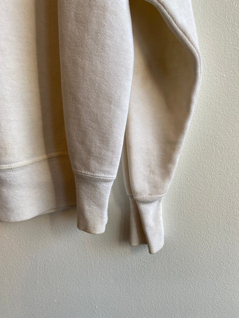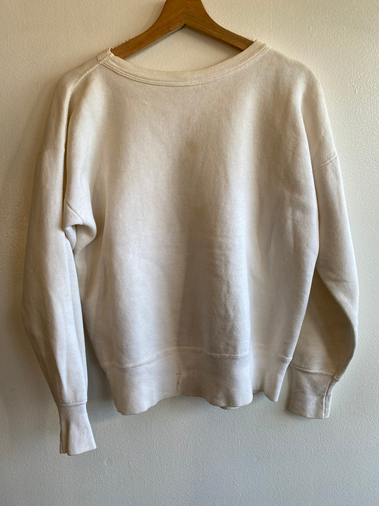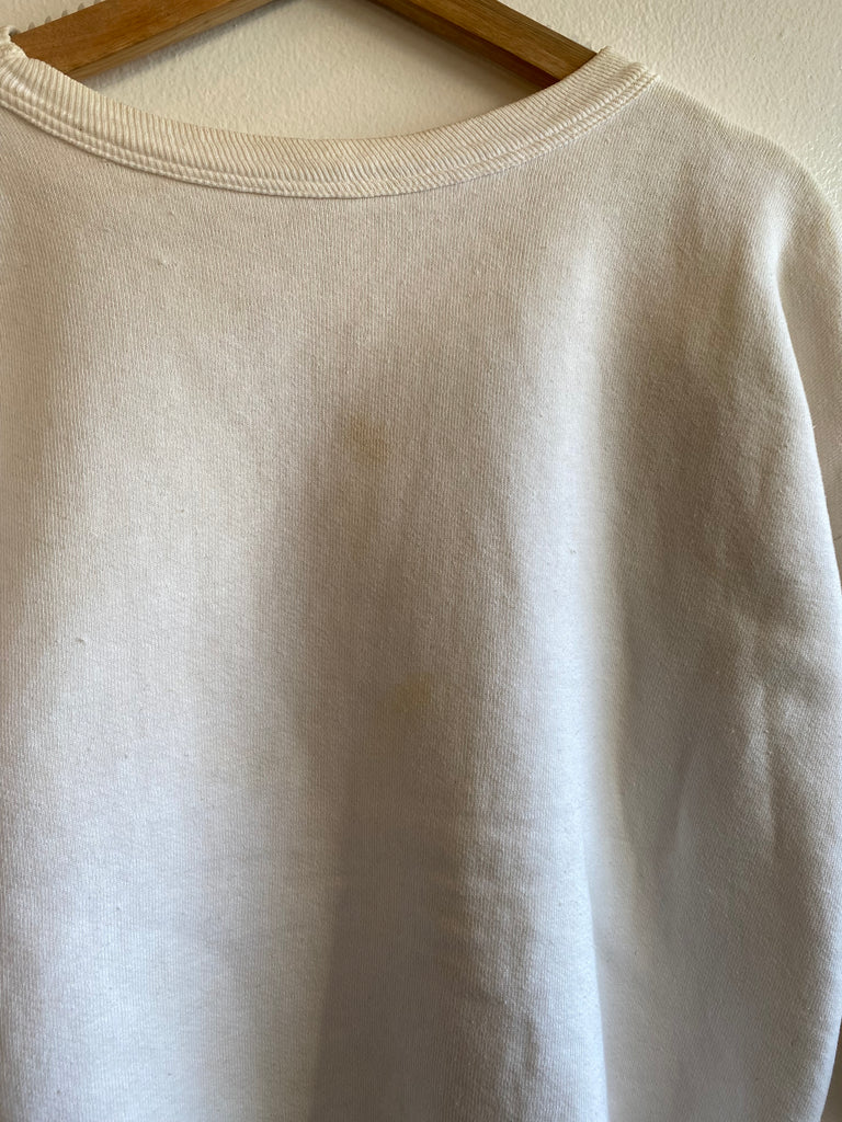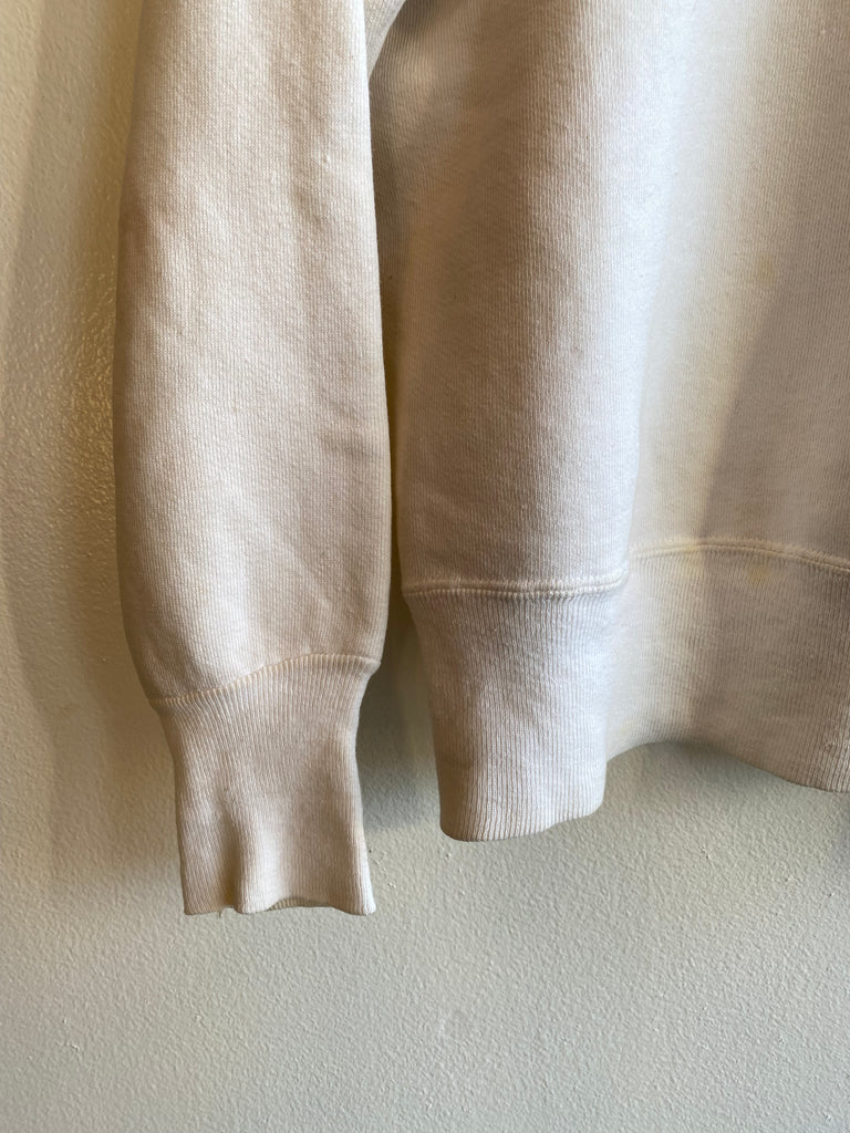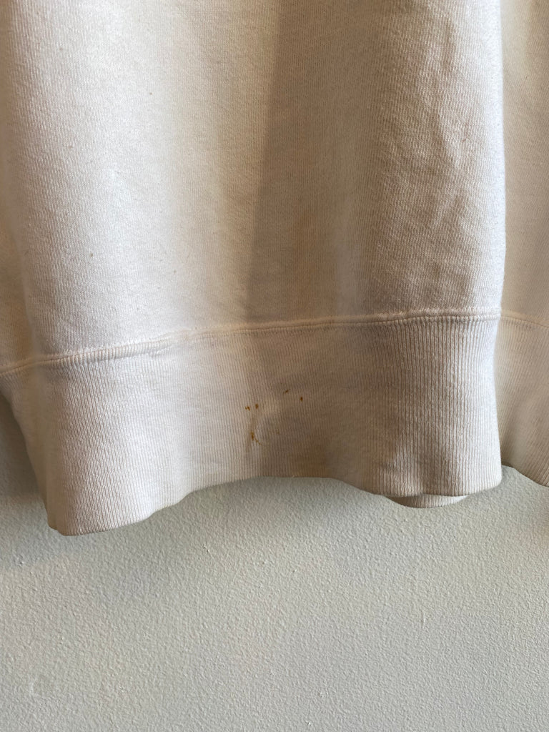 The star of the show if you like them old and fuzzy! Beautiful Kappa Sig sweatshirt in the classic 1950’s style, mounted collar and extendo cuffs. Red flock print with plenty of fuzz left! Exposed overlock stitching on the shoulders and the rest is tucked. Slightly stretched collar and some staining throughout, specifically on the back of the waist hem. To be expected with a 70 year old white garment, ready to go otherwise!