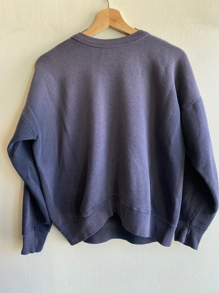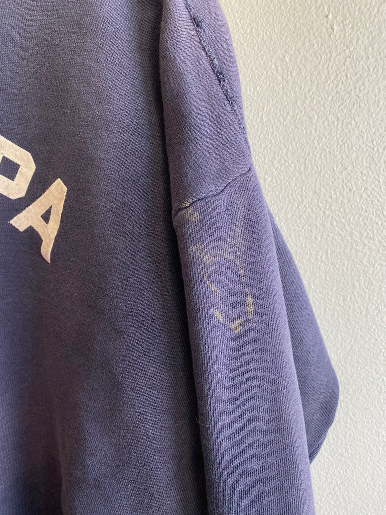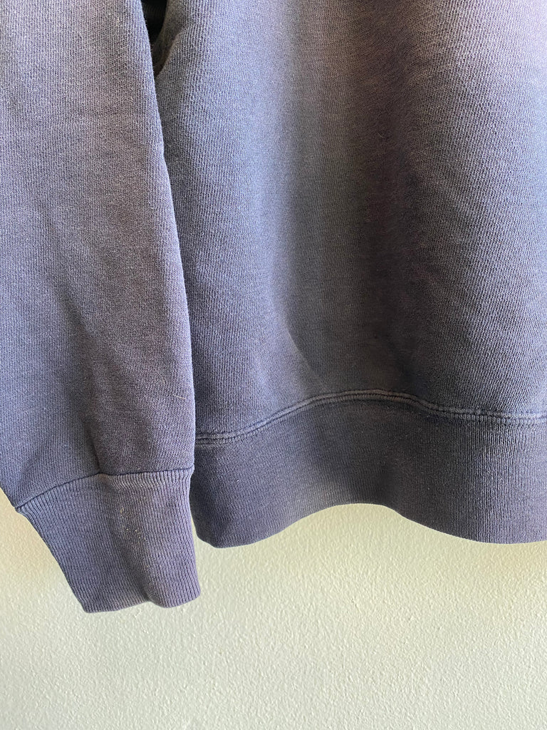 Sunfades and a big size? Now that’s what I’m talking about. Killer Pi Kappa fraternity sweatshirt, missing tag but presumably Champion or Russell Southern. Overlock stitched shoulders, mounted collar and a large flocked print on the front. Super thick and comfy all cotton material. Some cracking and marks to the flock as well as sunfading to both sides. Some paint on the left shoulder and minor pinholes at the right shoulder and the stomach. All in all pretty great shape!